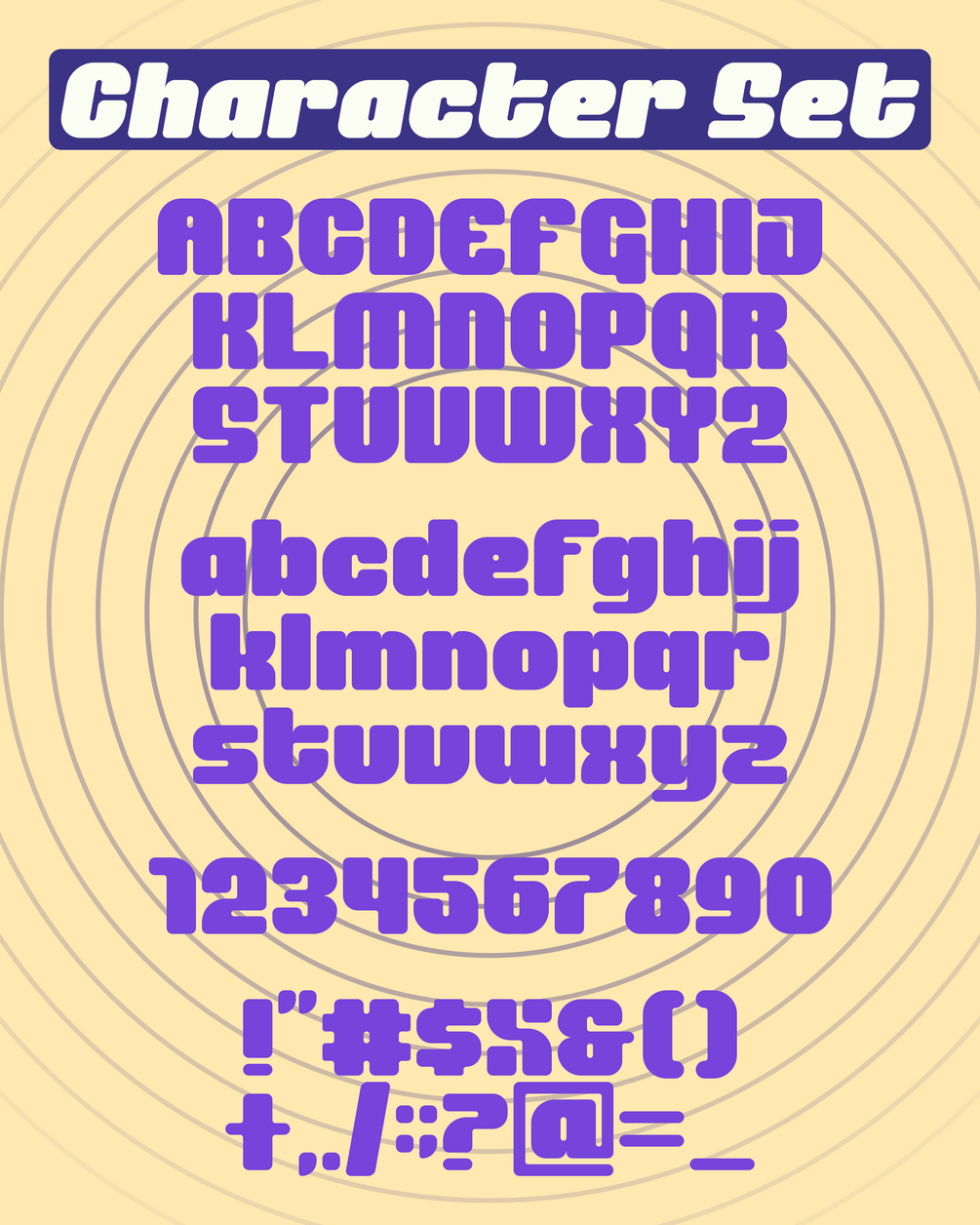 This typeface contains alphabets, numbers, symbols, and punctuations. It also has few alternative characters