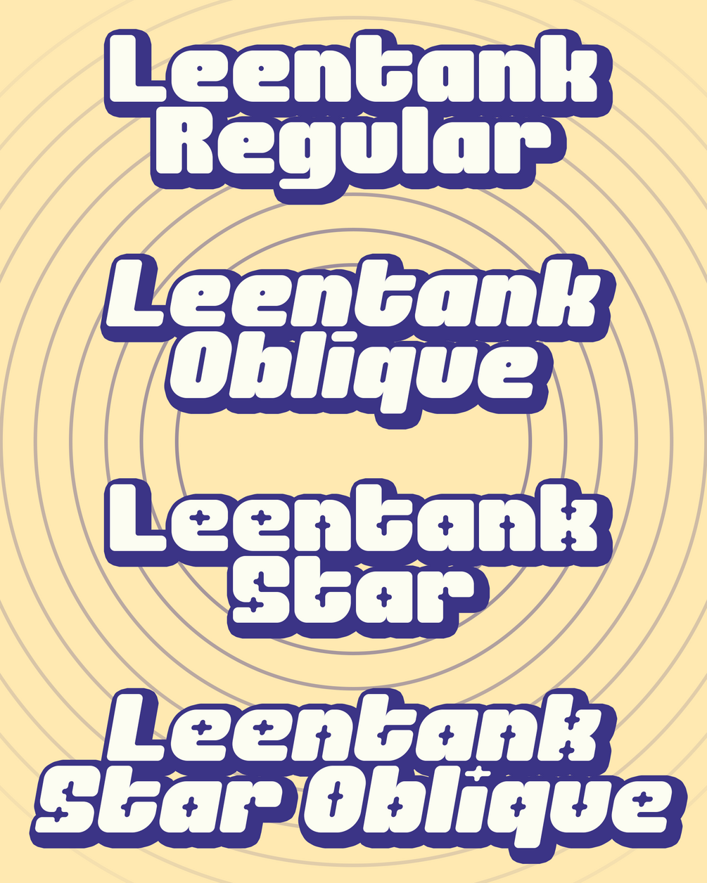 Leentank is a free basic rounded typeface by Julpik.This typeface has bold body,rounded edges, and available in regular, oblique, and star shaped style.