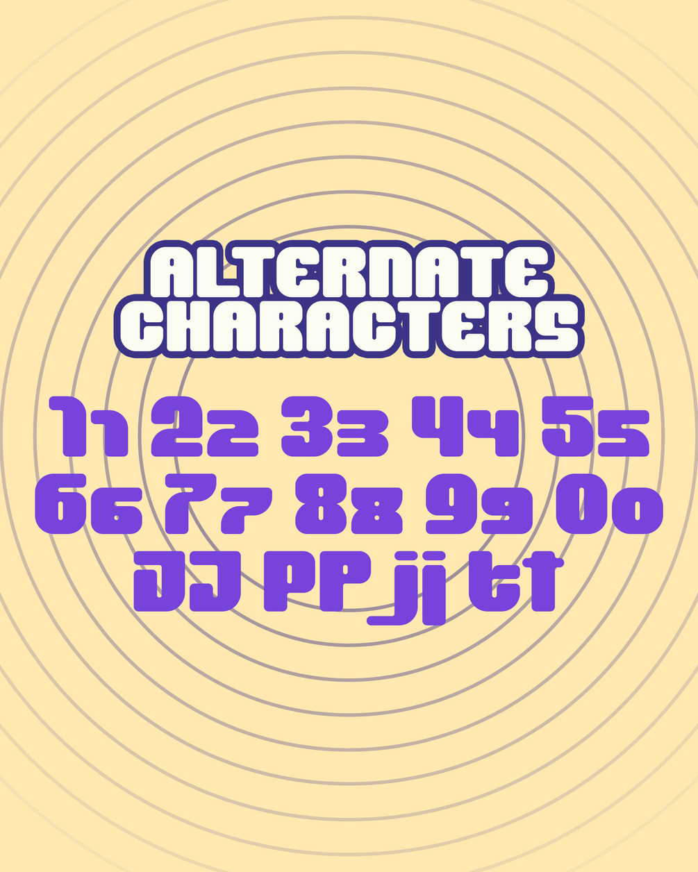 This typeface contains alphabets, numbers, symbols, and punctuations. It also has few alternative characters