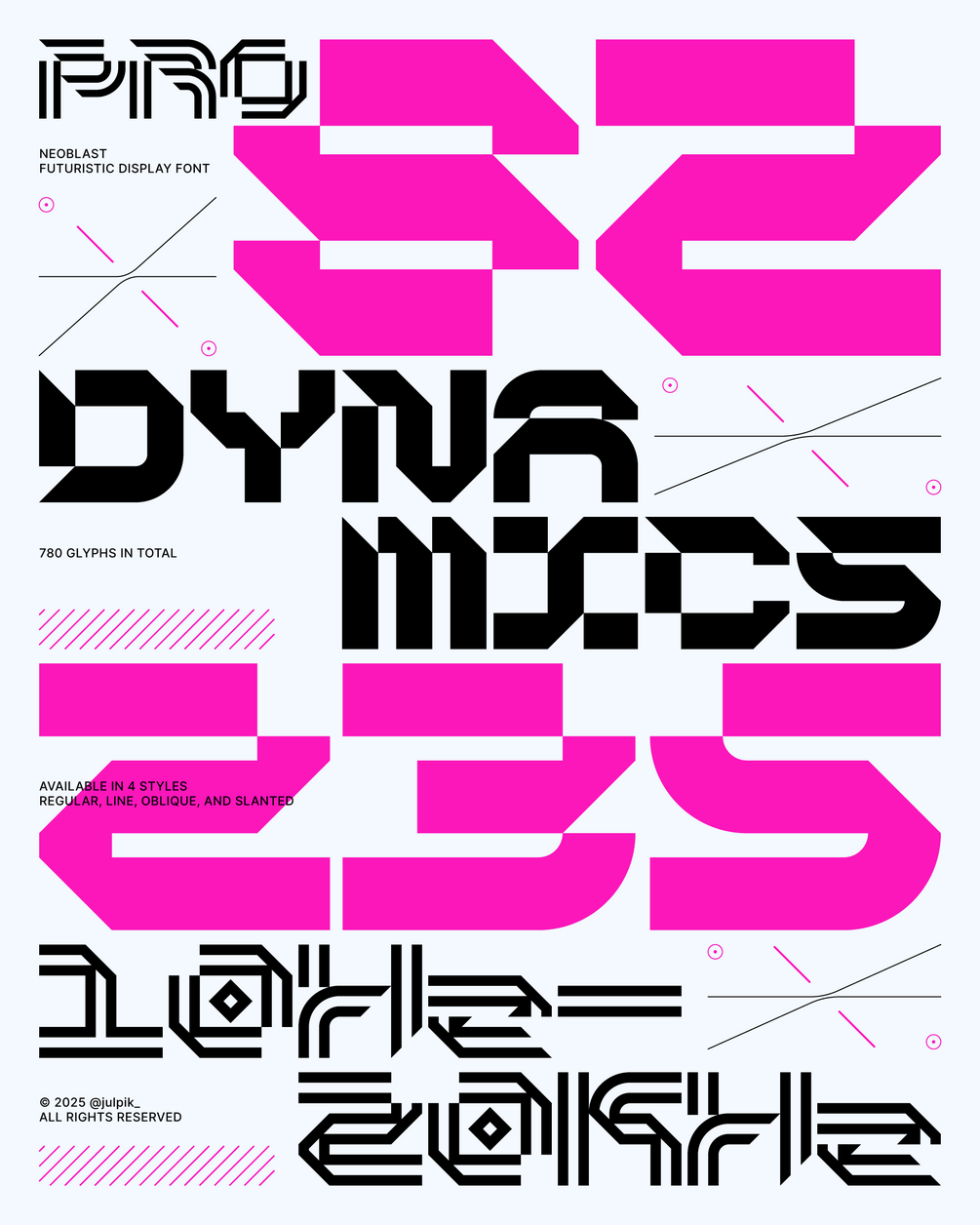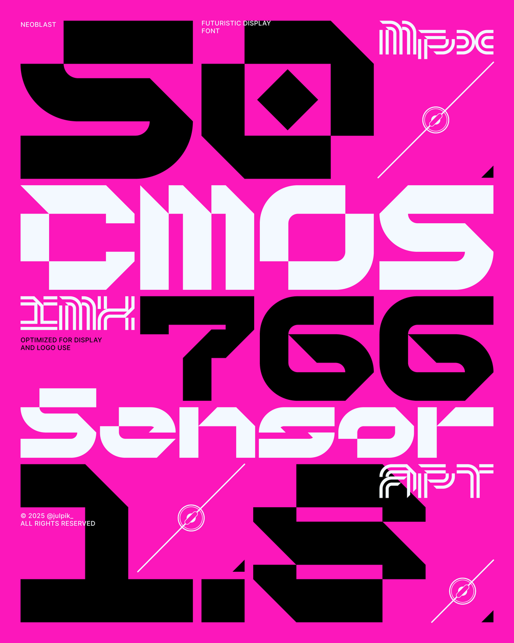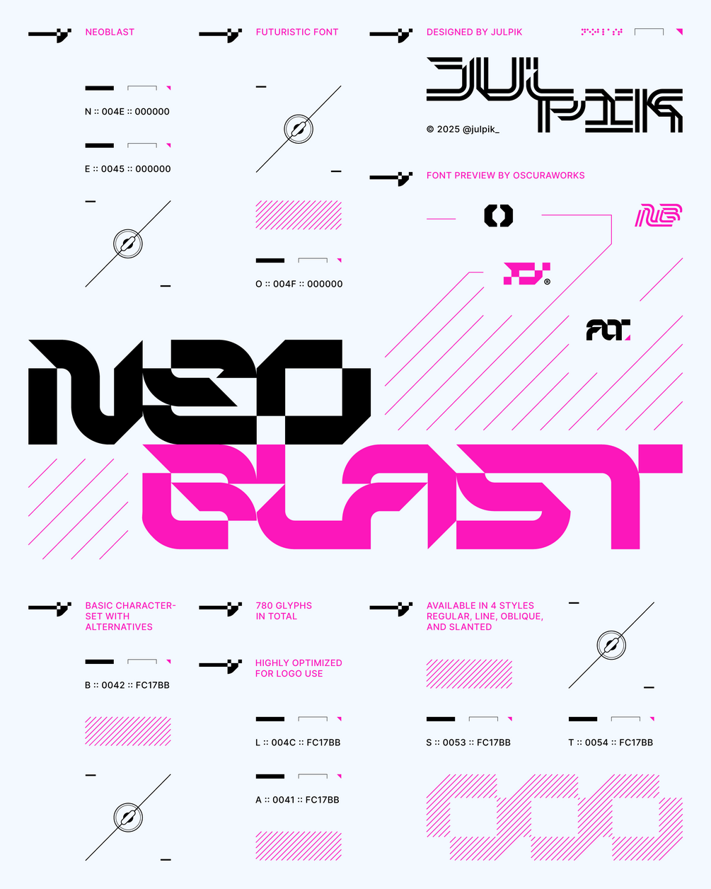 NeoBlast is a futuristic display font and optimized for logotype purpose. the letters are bold and has mixed of rounded and sharp edges. it has regular, line, oblique, and slanted styles. it's consist of uppercases, lowercases, numbers, symbols, and each letter has 3 alternative characters. it also can be used for poster design, tittle design, and many more~!