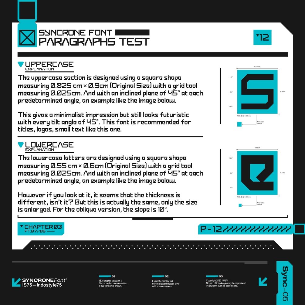Syncrone Font is a basic futuristic font that designed with minimalist and elegant looks, also has 45° degree at each specific edge.