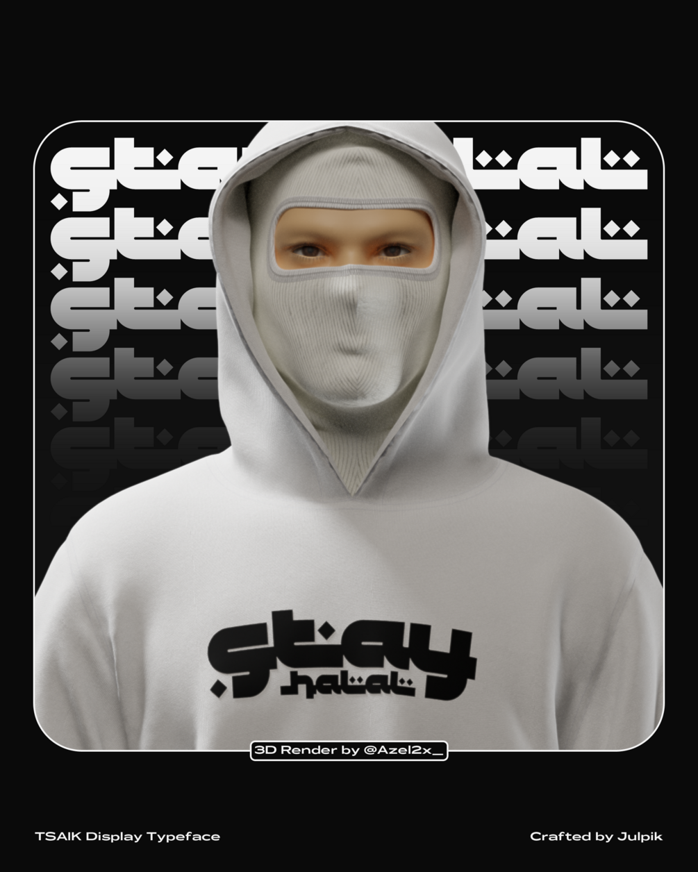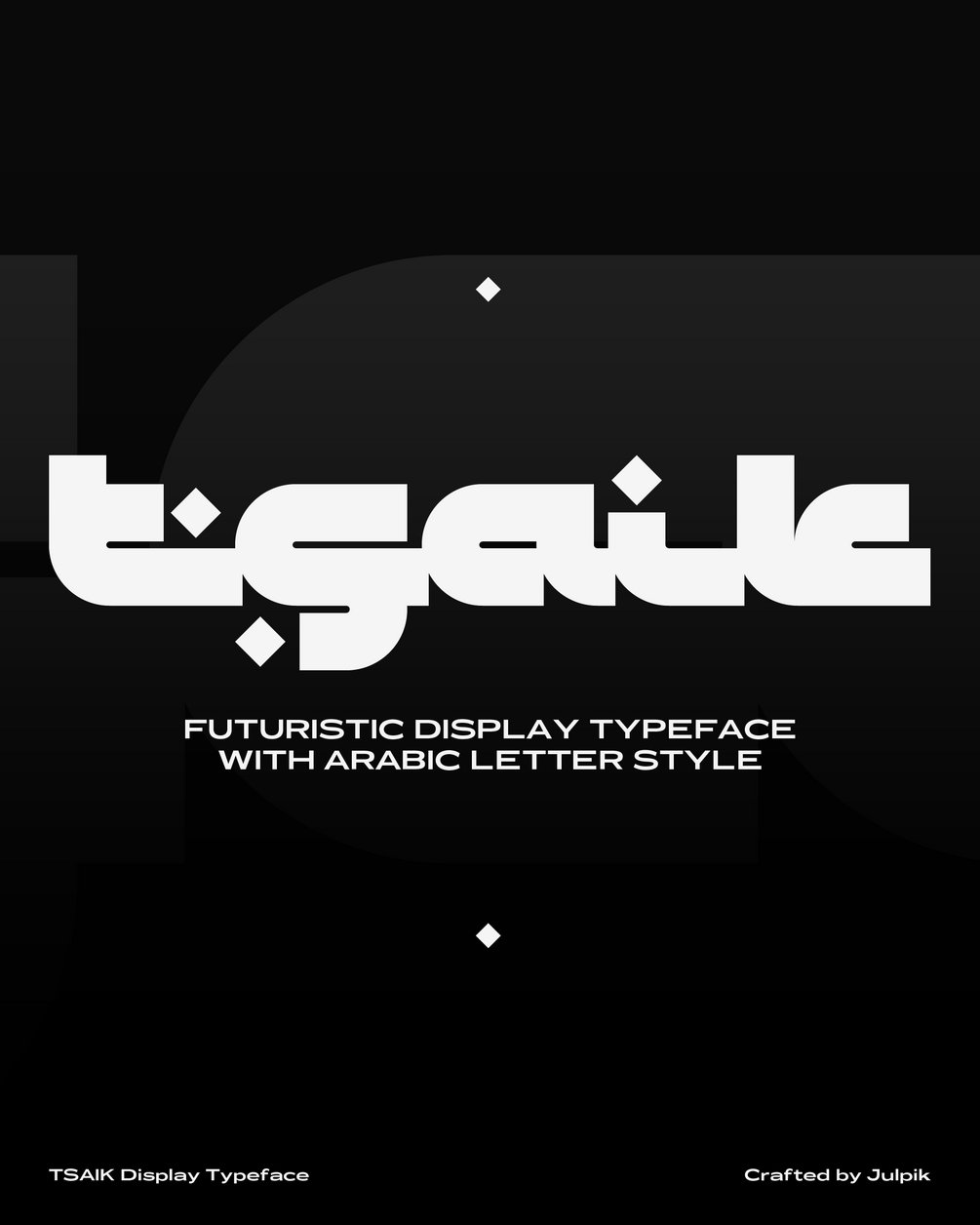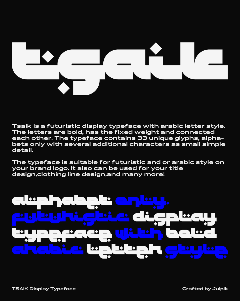 Tsaik is a futuristic display typeface with arabic letter style. The letters are bold, has the fixed weight and connected each other. The typeface contains 33 unique glyphs, alphabets only with several additional characters as small simple detail.