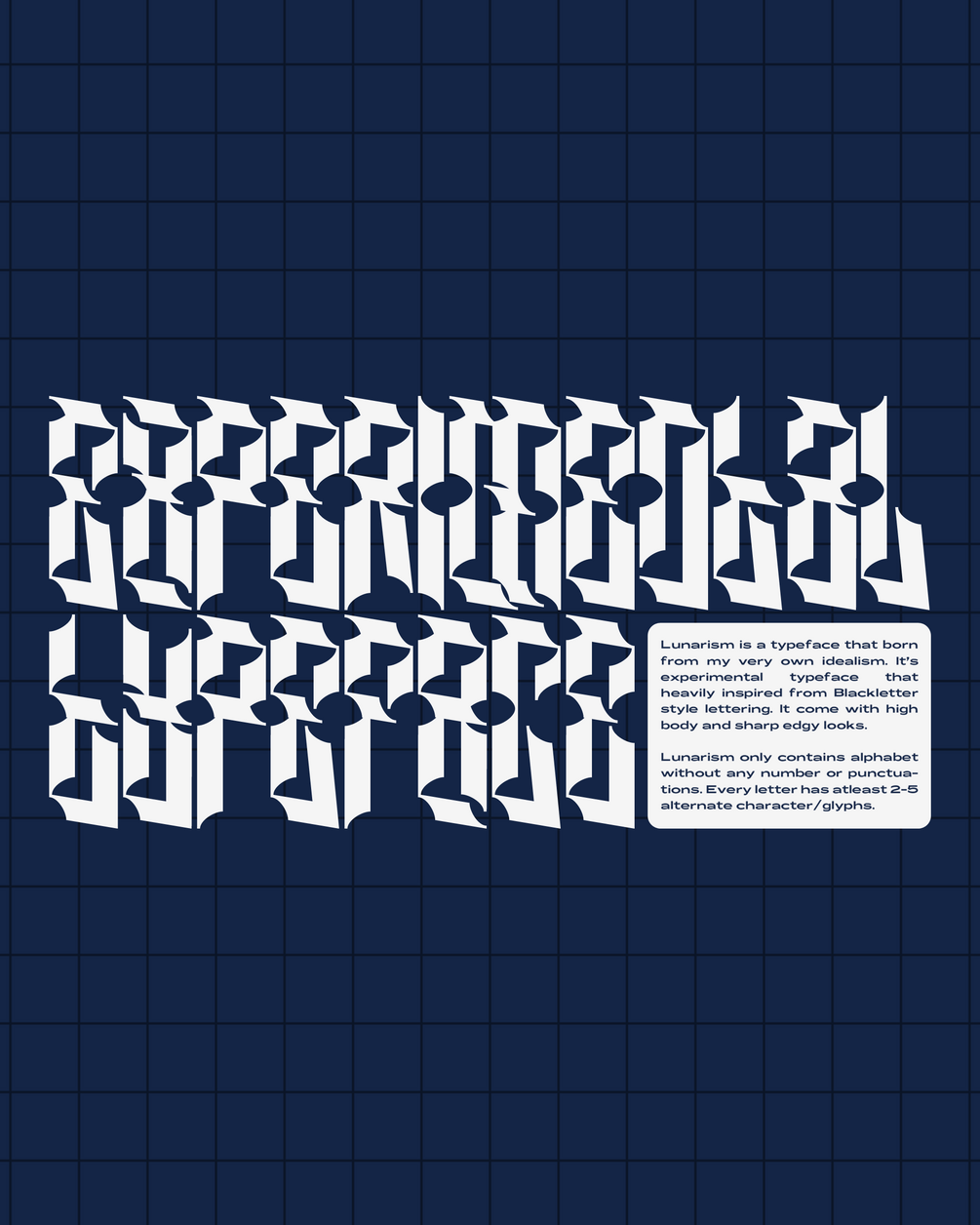 Lunarism is a typeface that born from my very own idealism. It's experimental typeface that heavily inspired from Blackletter style lettering. It come with high body and sharp edgy looks.