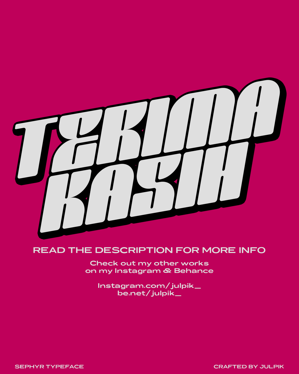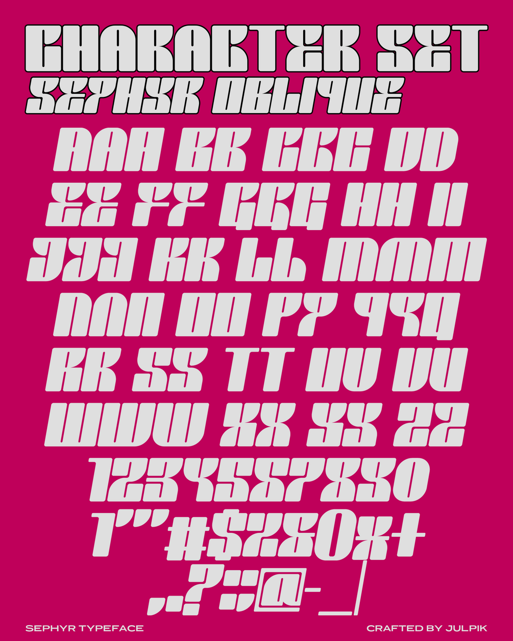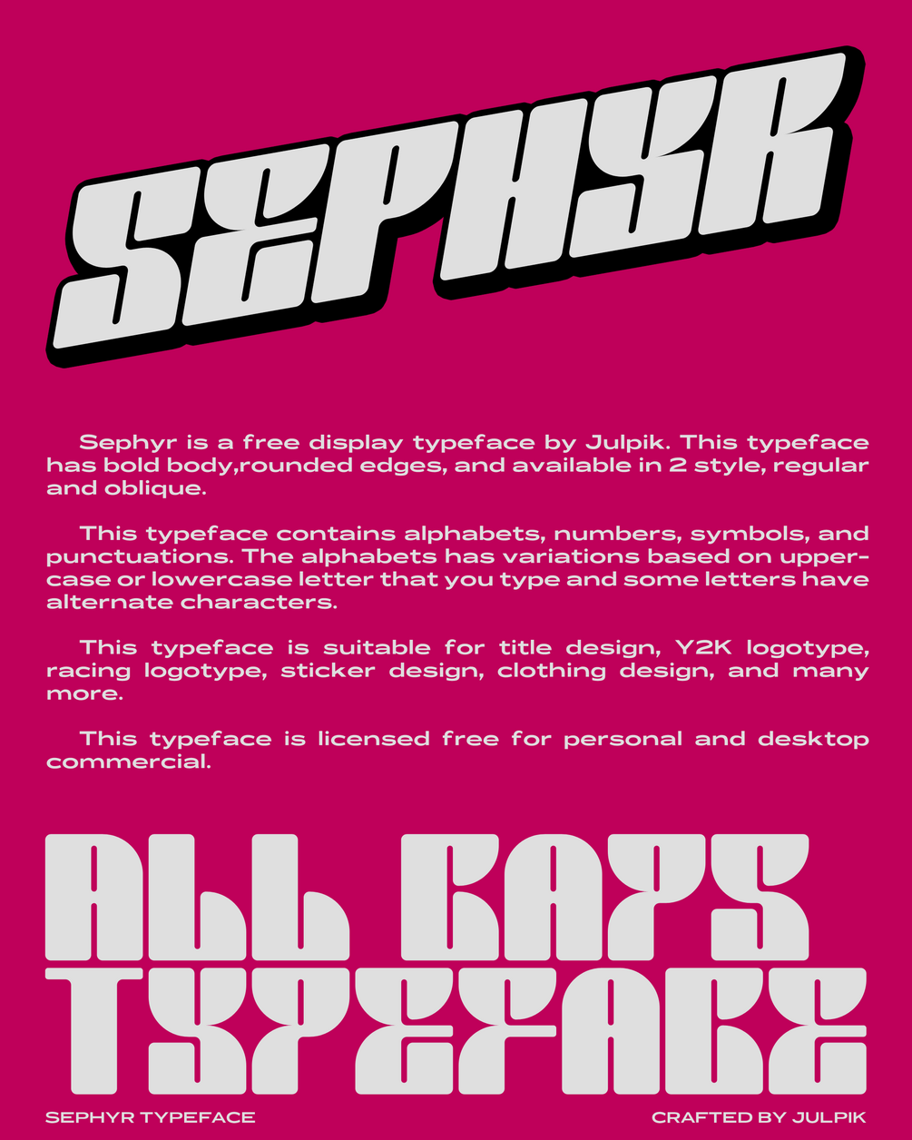 Sephyr is a free display typeface by Julpik. This typeface has bold body,rounded edges, and available in 2 style, regular and oblique.